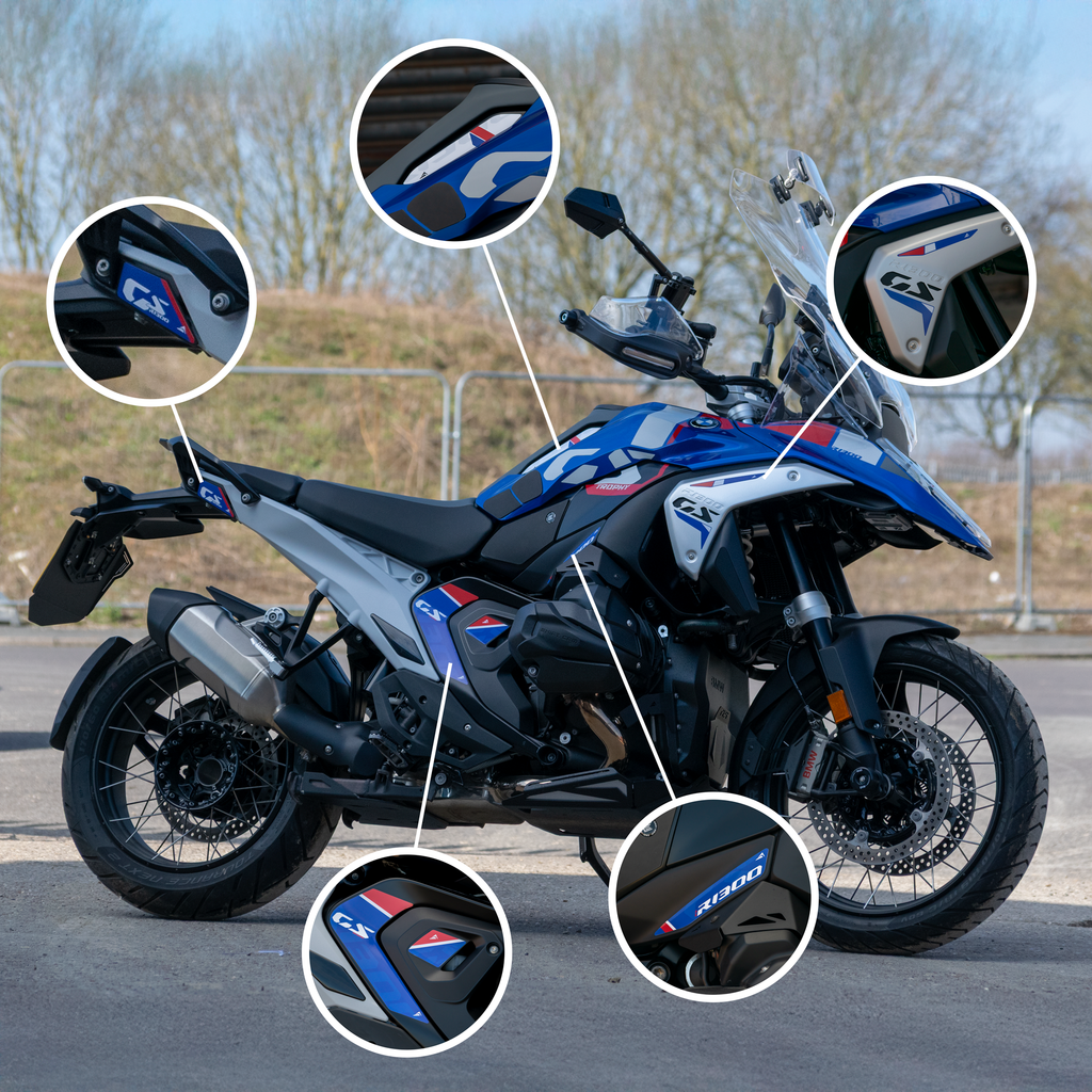 • This decal kit is specifically designed for the R1300GS 'Trophy' variant, featuring Racing Blue, Light White, and Racing Red.