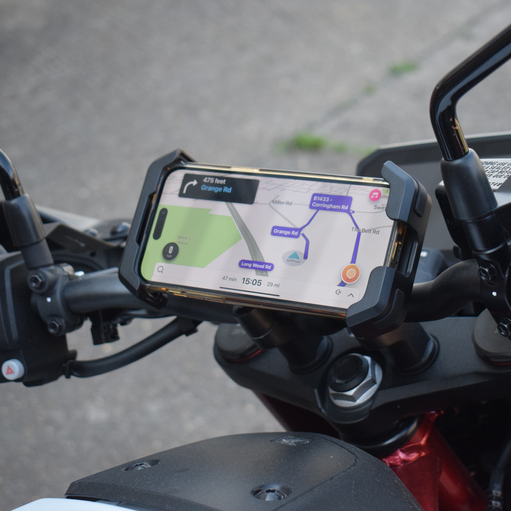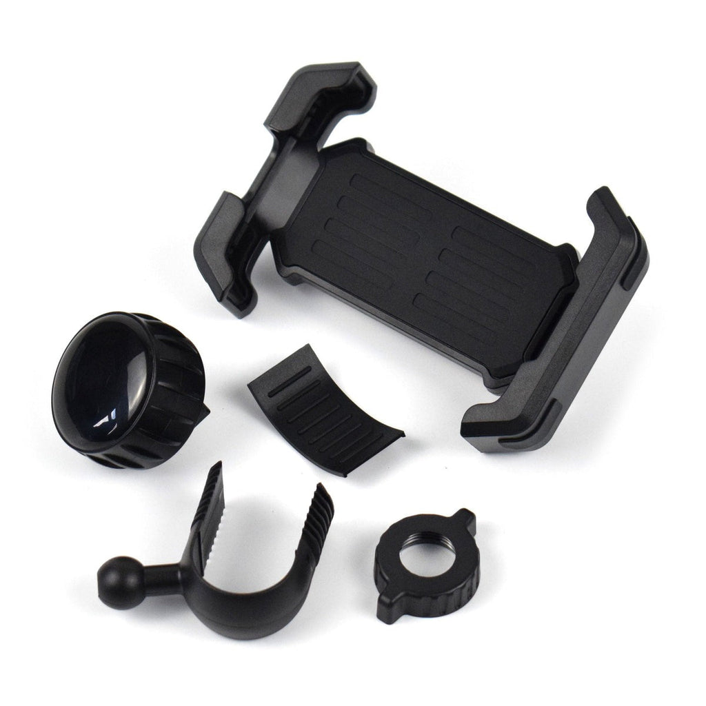 Universal Handlebar Phone Mount for motorcycles with tubular handlebars.