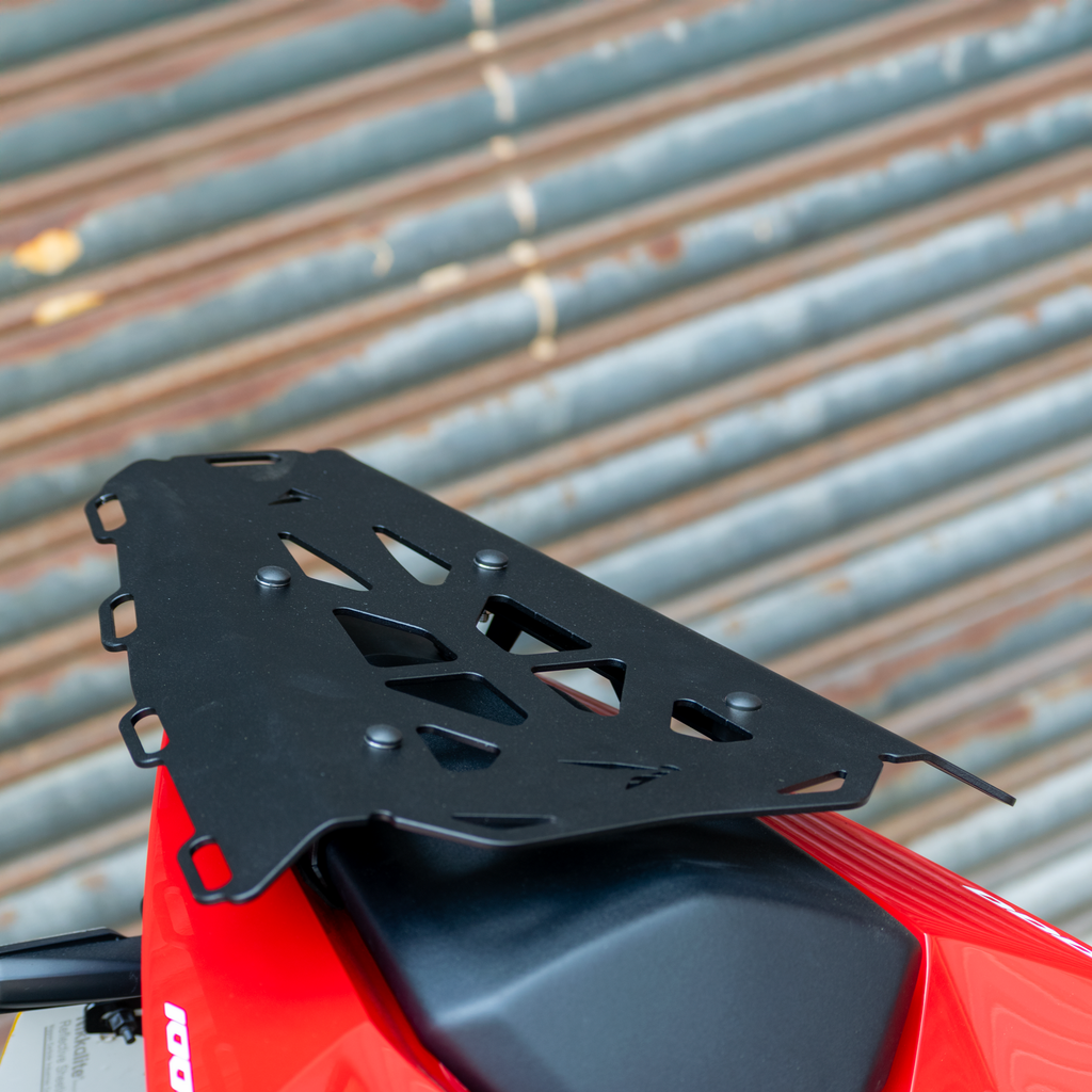 Crafted from aluminium, the Seat Rack integrates seamlessly with the bike's lines while providing multiple strap points for securing tail packs, duffel bags, or other soft luggage. Installation is quick and fully reversible—no modifications required.